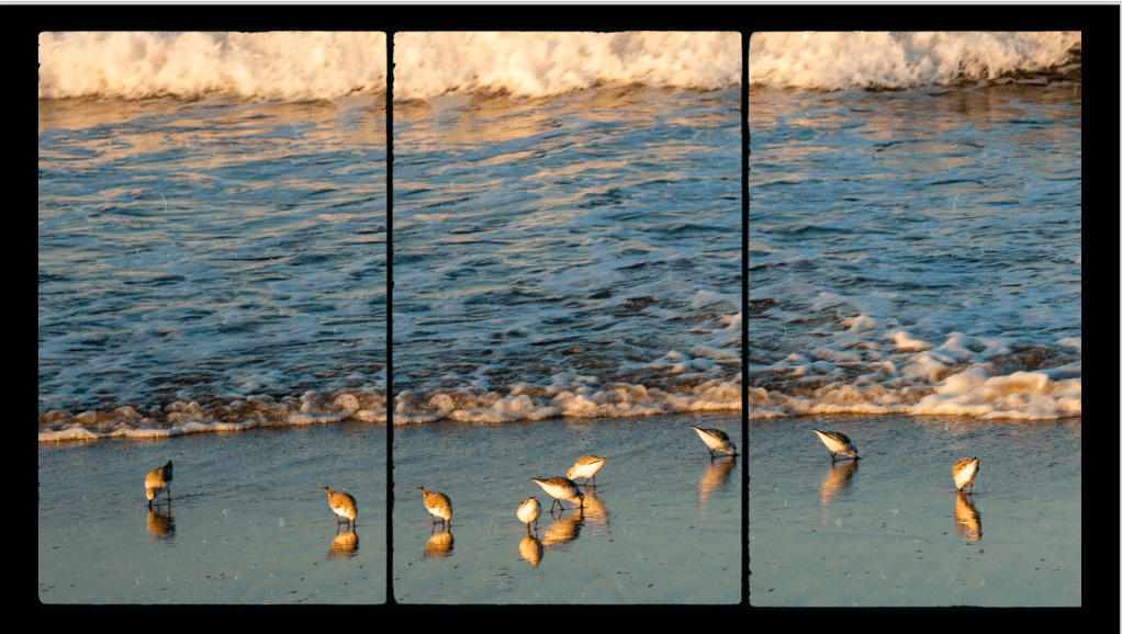 Three part beach photo with birds